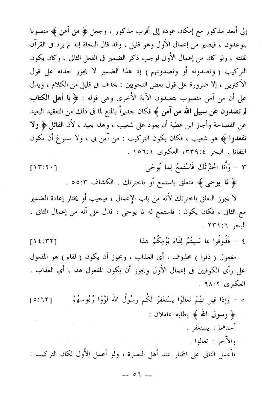 في الكشاف 2: 128: «فإن قلت: إلام يرجع الضمي رفي {آمن به} قلت: إلى كل صراط، تقديره: توعدون من آمن به وتصدون عنه، فوضع الظاهر الذي هو سبيل الله موضع الضمير، زيادة في تقبيح أمرهم، ودلالة على عظم ما يصدون عنه» ..