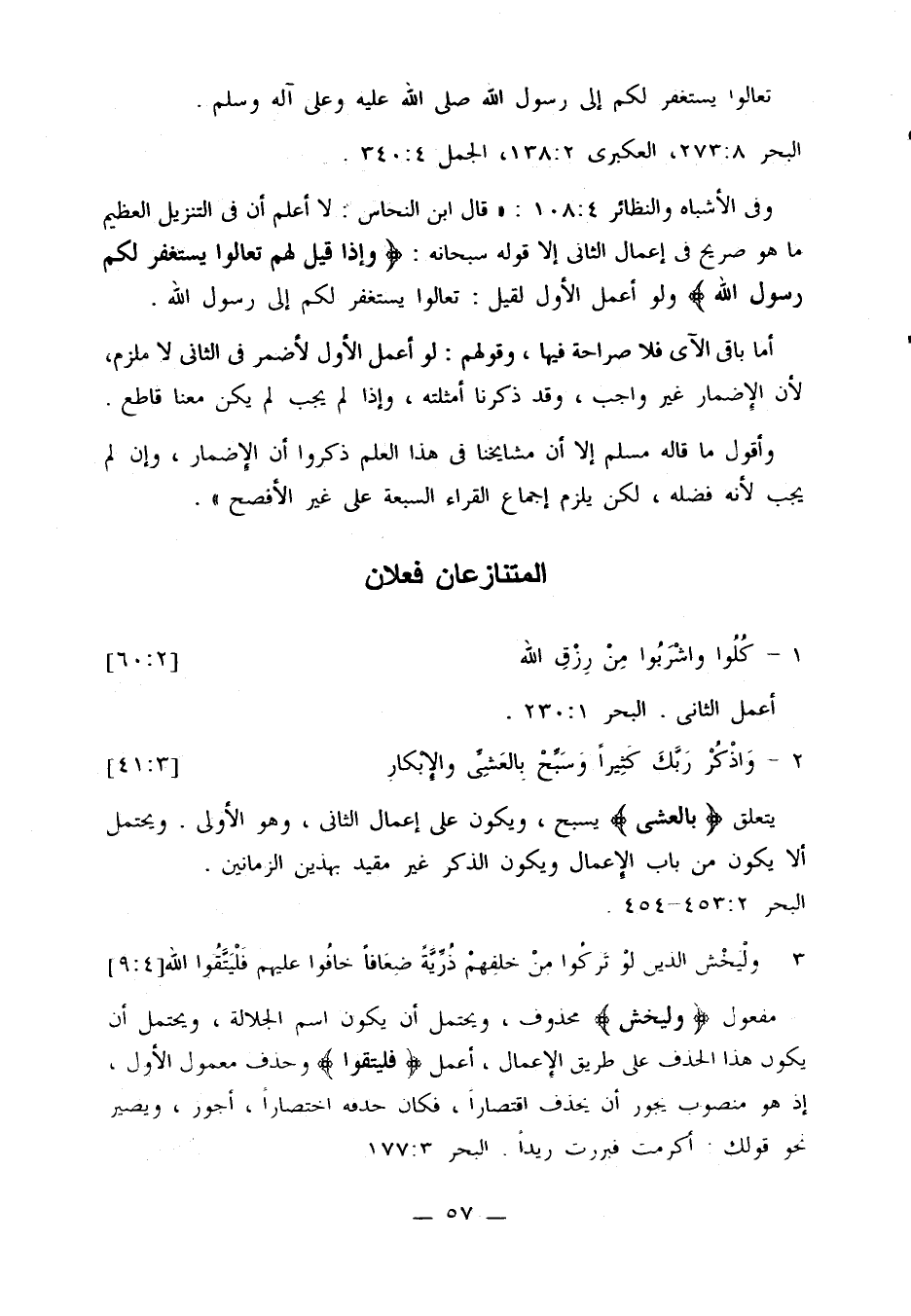 إلى أبعد مذكور مع إمكان عوده إلى أقرب مذكور، وجعل {من آمن} منصوبا يتوعدون، فيصير من إعمال الأول وهو قليل، وقد قال النحاة إنه لم يرد في القرآن لقلته، ولو كان من إعمال الأول لوجب ذكر الضمير في الفعل الثاني، وكان يكون التركيب (وتصدونه أو وتصدونهم) إذ هذا الضمير لا يجوز حذفه على قول الأكثرين، إلا ضرورة على قول بعض النحويين: يحذف في قليل من الكلام، ويدل على أن من آمن منصوب بتصدون الآية الأخرى وهي قوله: {يا أهل الكتاب لم تصدون عن سبيل الله من آمن} فكان جديرا بالمنع لما في ذلك التعقيد البعيد عن الفصاحة وأجاز ابن عطية أن يعود على شعيب، وهذا بعيد، لأن القائل {ولا تقعدوا} هو شعيب، فكان يكون التركيب: من آمن بي، ولا يسوغ أن يكون التفافا، البحر 4: 339، العكبري 1: 156.