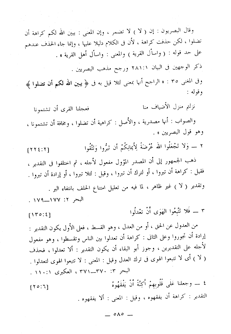 وفي معاني القرآن للفراء 1: 297: «ومعناه ألا تضلوا، ولذلك صلحت (لا) في موضع (أن) وهذه محنة لـ (أن) إذا صلحت في موضعها لئلا، وكيلا صلحت (لا)».