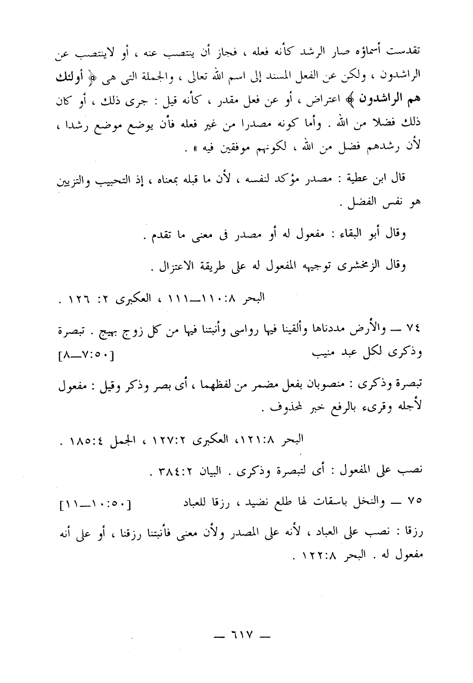 في الكشاف 4: 363: «{فضلا} مفعول له أو مصدر من غير فعله، فإن قلت: من أين جاز وقوعه مفعولاً له والرشد فعل القوم، والفضل فعل الله تعالى، والشرط أن يتحد الفاعل؟