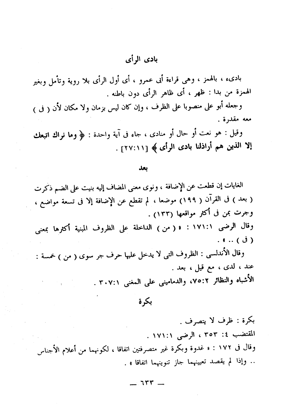 يكثر تصرفه إن كان مضافًا، جاء في القرآن في آية واحدة: {بل يريد الإنسان ليفجر أمامه} [75: 5] وهو ظرف مكان استعير للزمان في الآية، أي فيما يستقبله من الزمان.