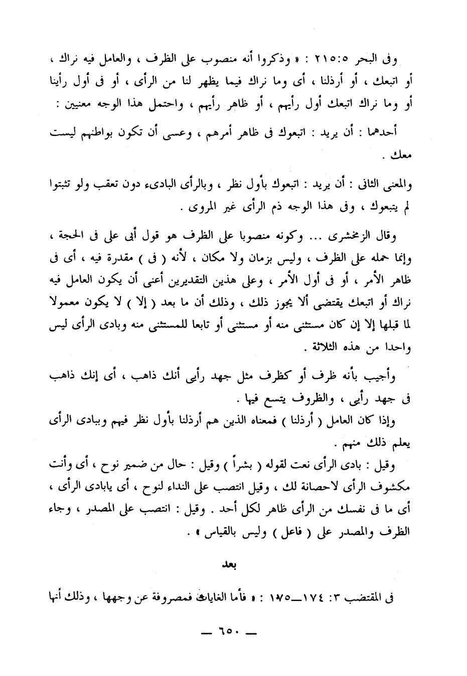 وفي الكشاف 2: 388: «وقرئ (بادى الرأي) بالهمز وغير الهمز بمعنى: اتبعوك أول الرأي، أو ظاهر الرأي، وانتصابه على الظرف، أصله: وقت حدوث أول رأيهم، أو وقت حدوث ظاهر رأيهم، فحذف ذلك، وأقيم المضاف إليه مقامه».