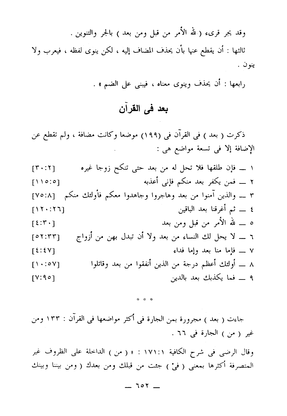 وفي الهمع 1: 209: «من الظروف المبنية في بعض الأحوال بعد، وهي ظرف زمان لازم الإضافة وله أحوال: