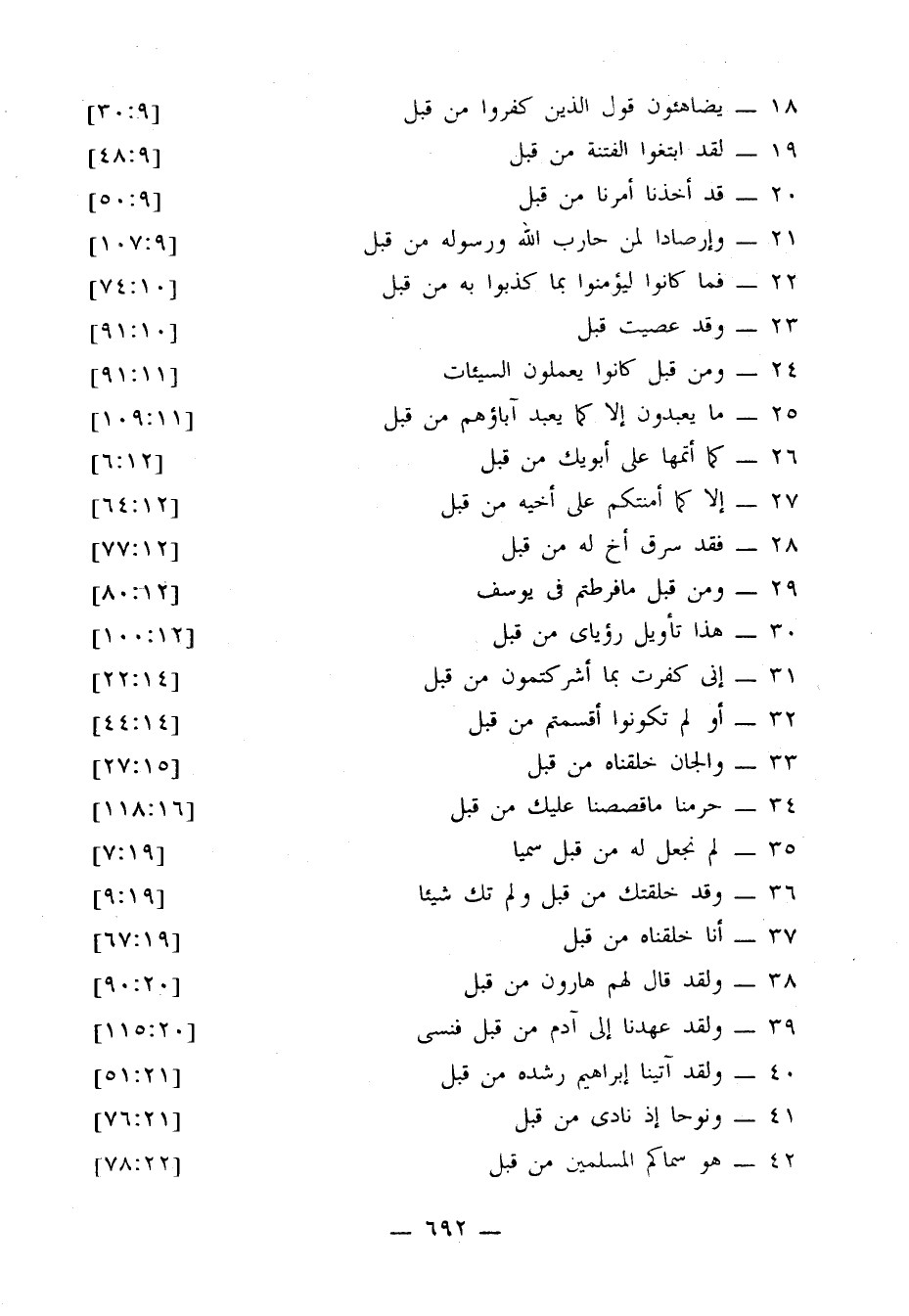 جاءت (قبل) في القرآن في 242 موضع، واقترنت بمن في أكثر مواضعها، وقد جاءت من غير (من) في 45 موضعًا، وقطعت عن الإضافة في 68 موضعًا نذكرها فيما يأتي: وبنيت على الضم.