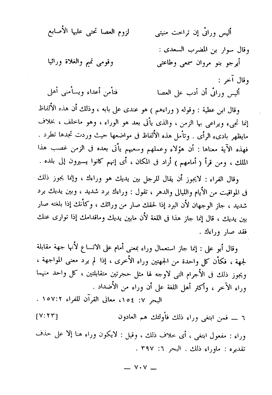 ووراء من الأضداد، قاله أبو عبيدة والأزهري، وقيل: ليس من الأضداد، قال ثعلب: اسم لما توارى عنك، سواء كان أمامك أم خلفك وقيل: بمعنى من خلفه، أي في طلبه، كما تقول: الأمر من ورائك، أي سوف يأتيك.