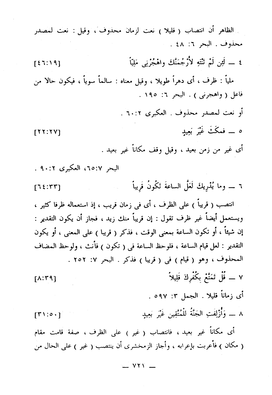 فإن لم يعرض قيامها مقامه، بل استعمل ظرفًا، وهي في الأصل صفة نحو قريب وملى حسن فيها التصرف، نحو سير عليه قريب، وسير عليه ملى من النهار، أي قطعته من النهار.