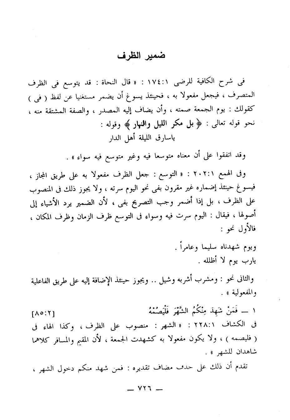 وفي المغني 638: «وهذا مخالف لكلامهم، إذ اشترطوا توافق مادة الظرف وعامله، ولم يكتفوا بالتوافق المعنوي كما في المصدر. والفرق أن انتساب هذا النوع على الظرفية على خلاف القياس لكونه مختصًا، فينبغي ألا يتجاوز به محل السماع».