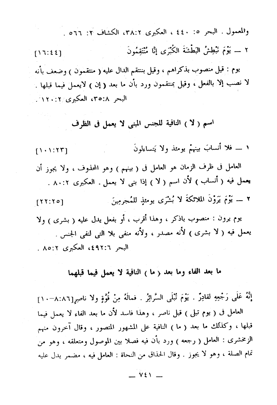 وهذا بعيد قد فصل على هذا القول بين العامل والمعمول بجمل كثيرة، فلا يناسب هذا القول فصاحة القرآن وبلاغته. البحر 8: 127، الكشاف 4: 288.