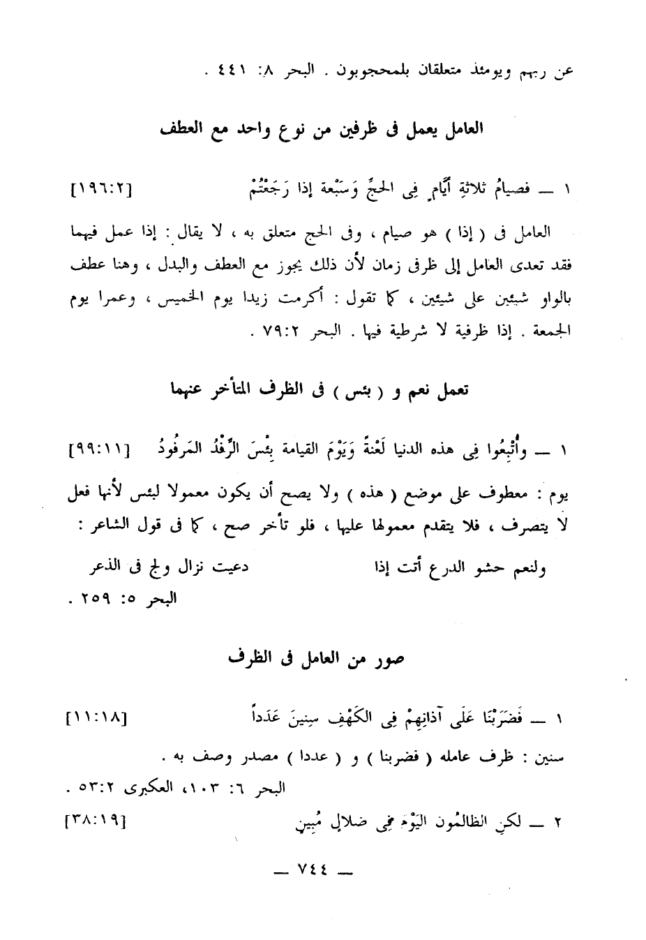 العامل في يوم (لا تأتيهم) وفيه دليل على أن ما بعد (لا) النافية يعمل فيما قبلها، وفيه ثلاثة مذاهب: الجواز مطلقًا، والمنع مطلقًا، والتفصيل بين أن يكون (لا) جواب قسم فيمتنع، أو غير ذلك فيجوز، وهو الصحيح.