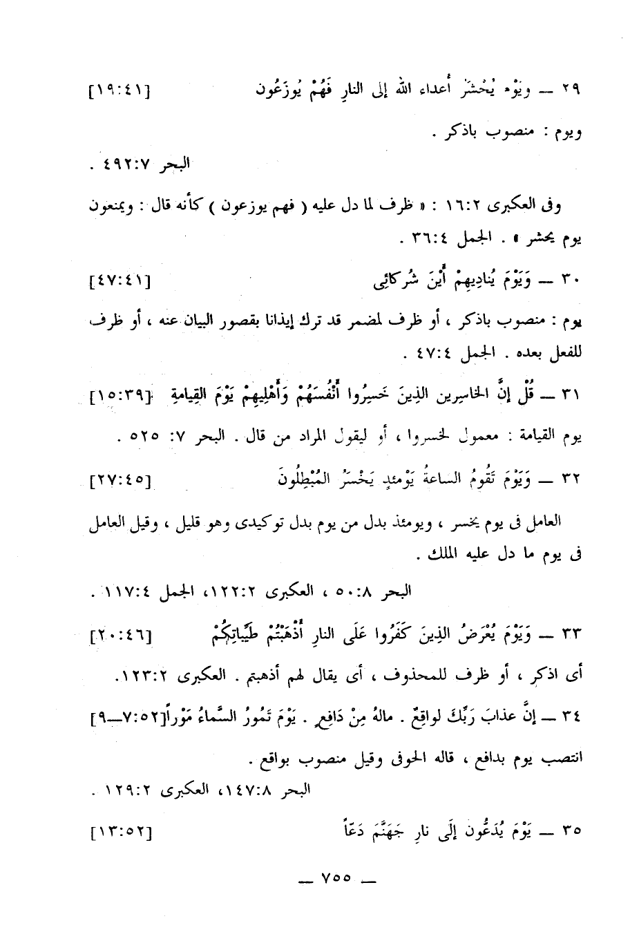 الظاهر تمام الجملة عند قوله (وعشيا) وأن (يوم) معمول لمحذوف على إضمار القول، أي يقال لهم تقوم الساعة. وقيل (يوم) معطوف على (عشيا) فالعامل فيه (يعرضون) وقيل العامل (أدخلوا). البحر 7: 468، الجمل 4: 18.