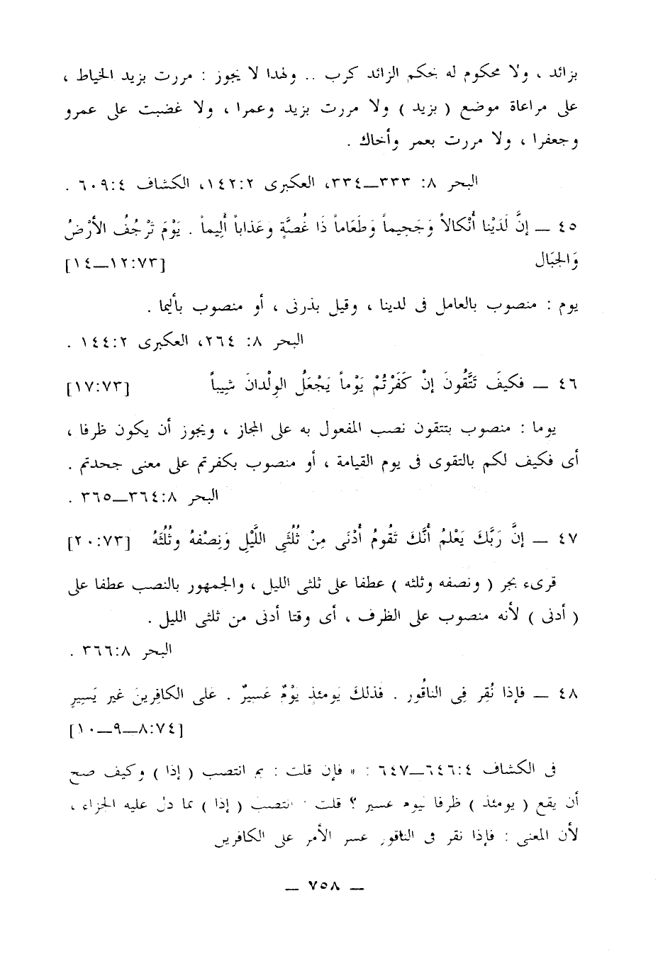 يوم: منصوب بإضمار فعل، أي يقع يوم تكون، أو تكون السماء كالمهل كان كيت وكيت أو بقريبا، أو بدل من ضمير (تراه) إذا كان عائدًا على يوم القيامة.
