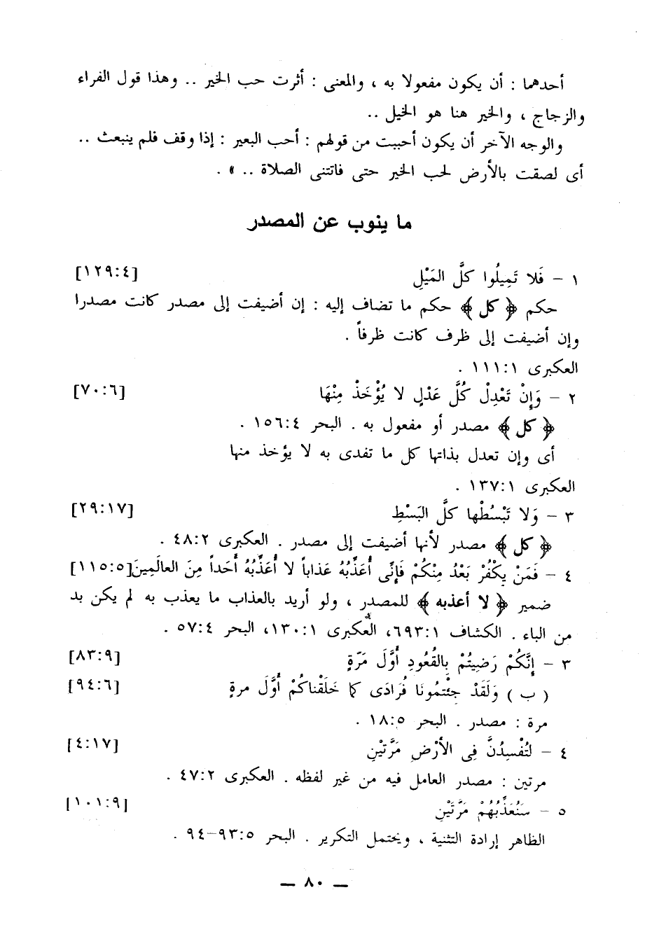 في أمالي الشجري 1: 57 - 58: «وظاهر لفظ قوله تعالى: {أحببت حب الخير} أن انتصاب {حب الخير} على المصدر، وليس كذلك، لأنه لم يخبر أنه حبا مثل حب الخير، كما قال: {فشاربون شرب الهيم} أي ضربا مثل شرب الهيم .. لأنه لو أراد هذا لأخرج الخيل عن أن تكون من الخير، إذ التقدير: أحببت الخيل حبا مثل حب الخير، وإذا كان هذا المقياس ظاهر الفساد كان انتصاب {حب الخير} على وجهين.
