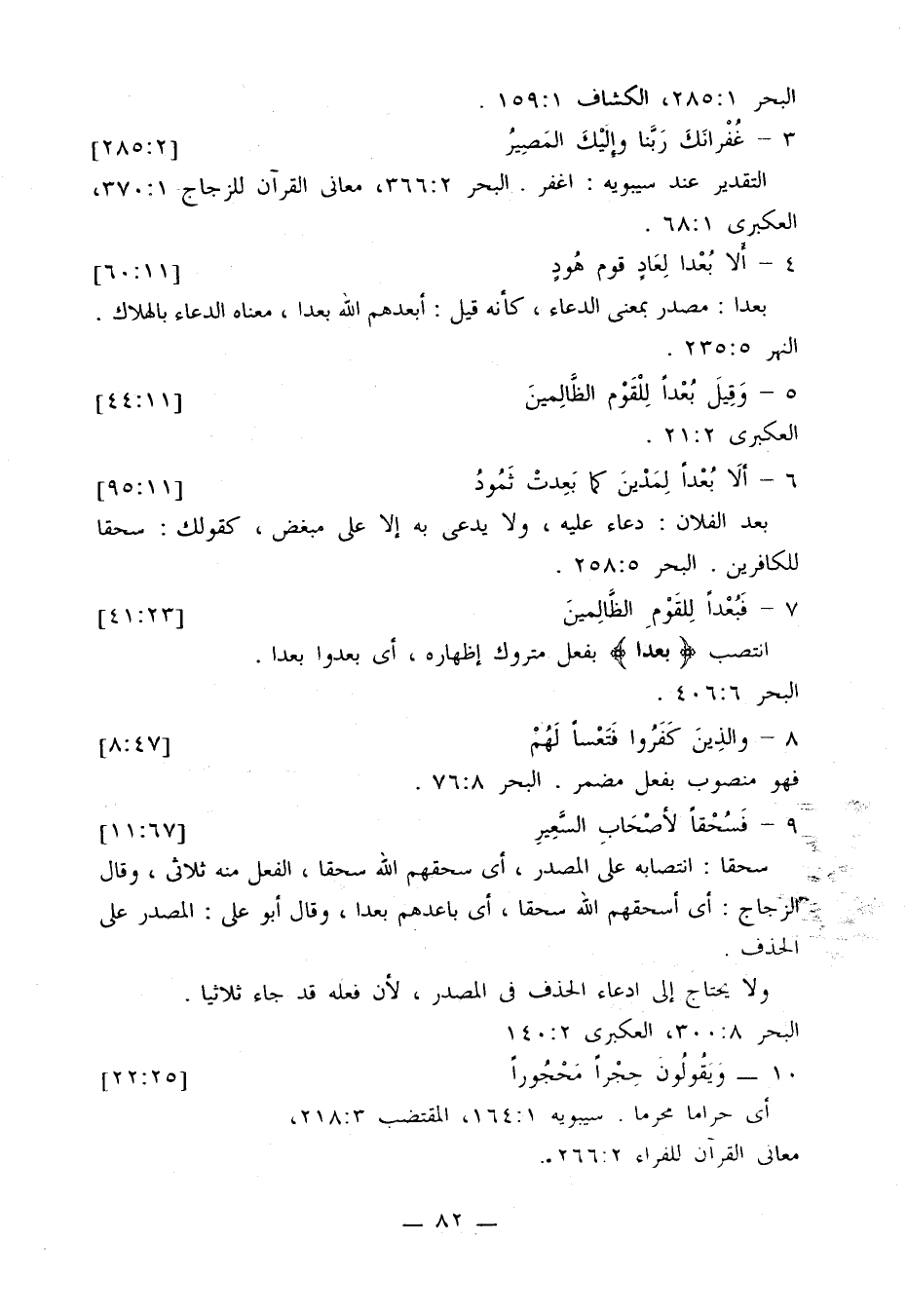 1 - {وإذ أخذنا ميثاق بني إسرائيل لا تعبدون إلا الله وبالوالدين إحسانا} [2: 83]. أي وأحسنوا بالوالدين إحسانا، البحر 1: 283 - 284، معاني القرآن للزجاج 1: 137، الكشاف 1: 159.