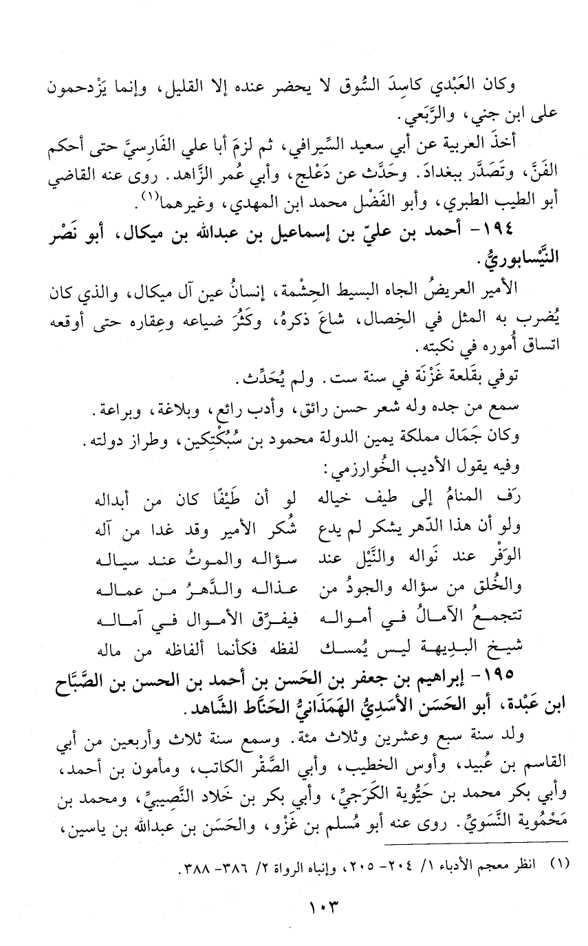 195 - إبراهيم بْن جعفر بْن الحَسَن بْن أحمد بْن الحَسَن بْن الصّبّاح بْن عَبْدة، أبو الحسن الأسدي الهمذاني الحناط الشاهد. [المتوفى: 406 هـ]