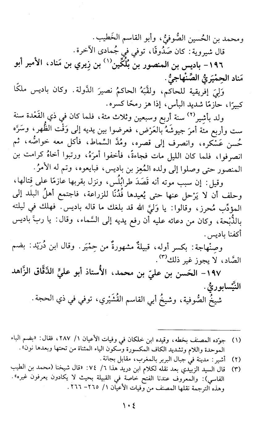 196 - باديس بْن المنصور بْن بُلّكين بْن زيْري بْن مَنَاد، الأمير أبو مَنَاد الحِمْيَريّ الصنْهَاجيّ. [المتوفى: 406 هـ]