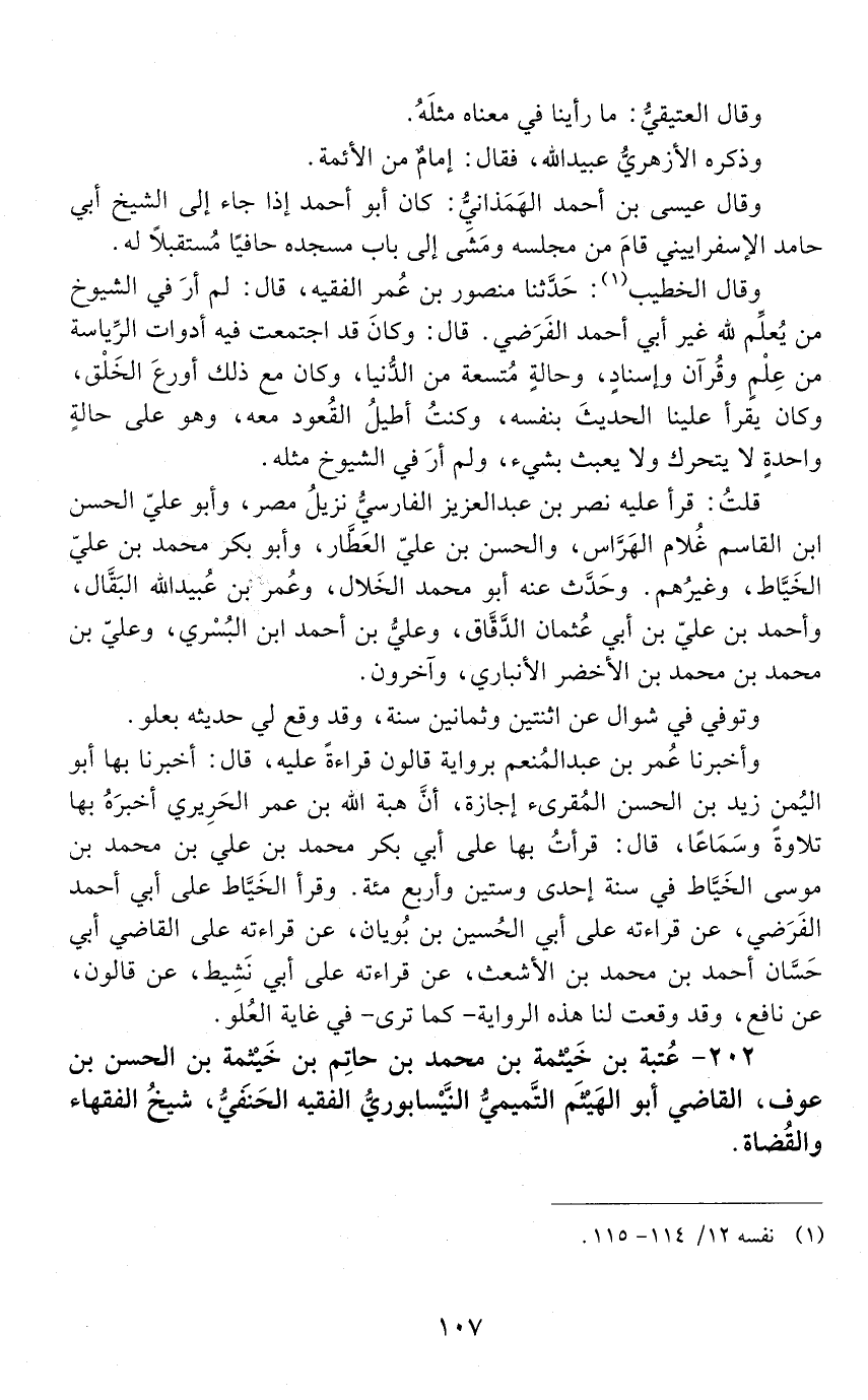 202 - عُتْبة بْن خَيْثَمَة بْن محمد بْن حاتم بْن خَيْثَمَة بْن الحَسَن بْن عَوْف، القاضي أبو الهيثم التّميميّ النَّيْسابوريّ الفقيه الحنفيّ، [المتوفى: 406 هـ]