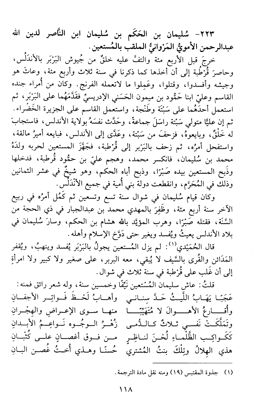 223 - سليمان بن الحكم بن سليمان ابن النّاصر لدين الله عَبْد الرَّحْمَن الأمويّ المروانيّ الملقب بالمستعين. [المتوفى: 407 هـ]