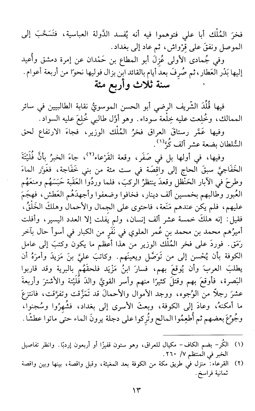 وفيها، في أوّلها بل في صَفرَ، وقْعة القرعاء، جاء الخبر بأن فُلَيْتَة الخَفَاجيّ سبق الحاجّ إلى واقصة في ستّمائة من بني خَفَاجة، فغّور الماء وطرحَ في الآبار الحنظل، وقعد ينتظر الرَّكْب. فلمّا وردوا العَقبَة حَبسهم ومنعهم العبور، وطالبهم بخمسين ألف دينار. فخافوا وضعُفُوا، وأجهدهم العطش، فهجم عَليْهم، فلم يكن عندهم مَنَعَة، فاحتوى عَلَى الجِمال والأحمال وهلك الخلق، فقيل: إنّه هلك خمسة عشر ألف إنسان، ولم يُفلت إلا العدد اليسير، وأفلتَ أميرهم محمد بْن محمد بن عُمَر العلويّ في نفرٍ من الكِبار في أسوأ حال بآخر رَمقَ. فورد عَلَى فخر المُلْك الوزير من هذا أعظم ما يكون وكتبَ إلى عامل الكوفة بأن يُحسن إِلَى من توصّل ويُعينهم. وكاتب عليّ بْن مَزْيد وأمره أن يطلب العرب، وأن يُوقِع بهم، فسارَ ابن مَزْيد، فلِحقهم بالبّريّة وقد قاربوا البصرة، فأوقع بِهِم وقتل كثيرًا منهم وأسَر القوي والد فُلَيتَةَ والأشتر وأربعة عشر رجلًا من الوجوه، ووجدَ الأموال والأحمال قد تمزَّقت وتفّرقت، فانتزع ما أمكنه وعاد إلى الكوفة، وبعث الأسرى إلى بغداد، فشُهّروا وسجِنوا، وجُوع بعضهم، ثم أطعموا المالح، وتُرِكوا على دجلة يرون الماء حَتَّى ماتوا عطشا. -[14]-