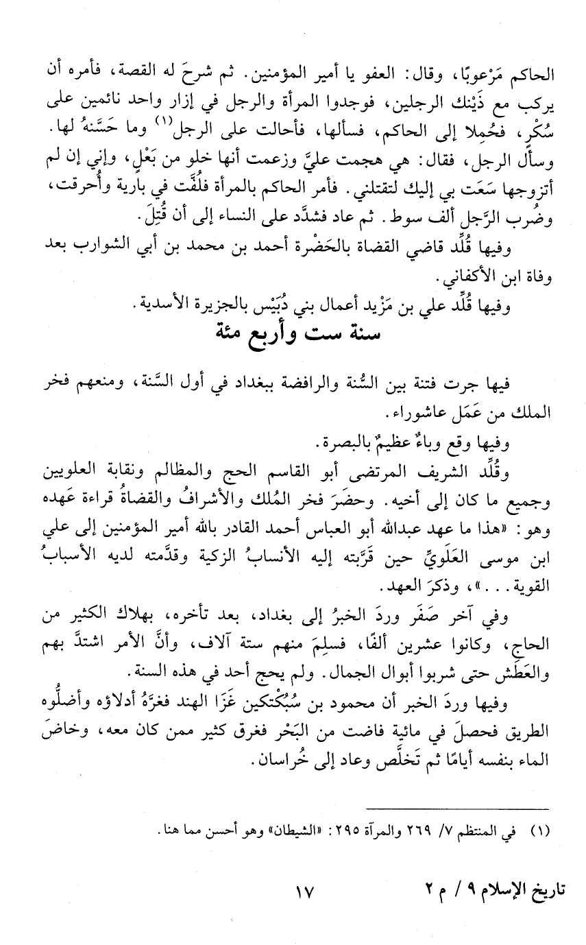 فيها جرت فتنة بين السُنة والرافضة ببغداد في أوّل السنة، ومنعهم فخر المُلك مِن عمل عاشوراء.