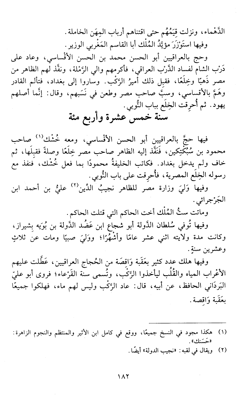 فيها حجّ بالعراقييّن أبو الحسن الأقساسيّ، ومعه خشك صاحب محمود بْن سُبُكْتكين، فنفّذ إِليْهِ الظاهر صاحب مصر خِلعًا وصلةً فقبِلَها، ثمّ خاف ولم يدخل بغداد. فكاتب الخليفةُ محمودًا بما فعل خشك، فنفذ مَعَ رسوله الخِلَع المصريّة، فأُحرِقت عَلَى باب النوبي.