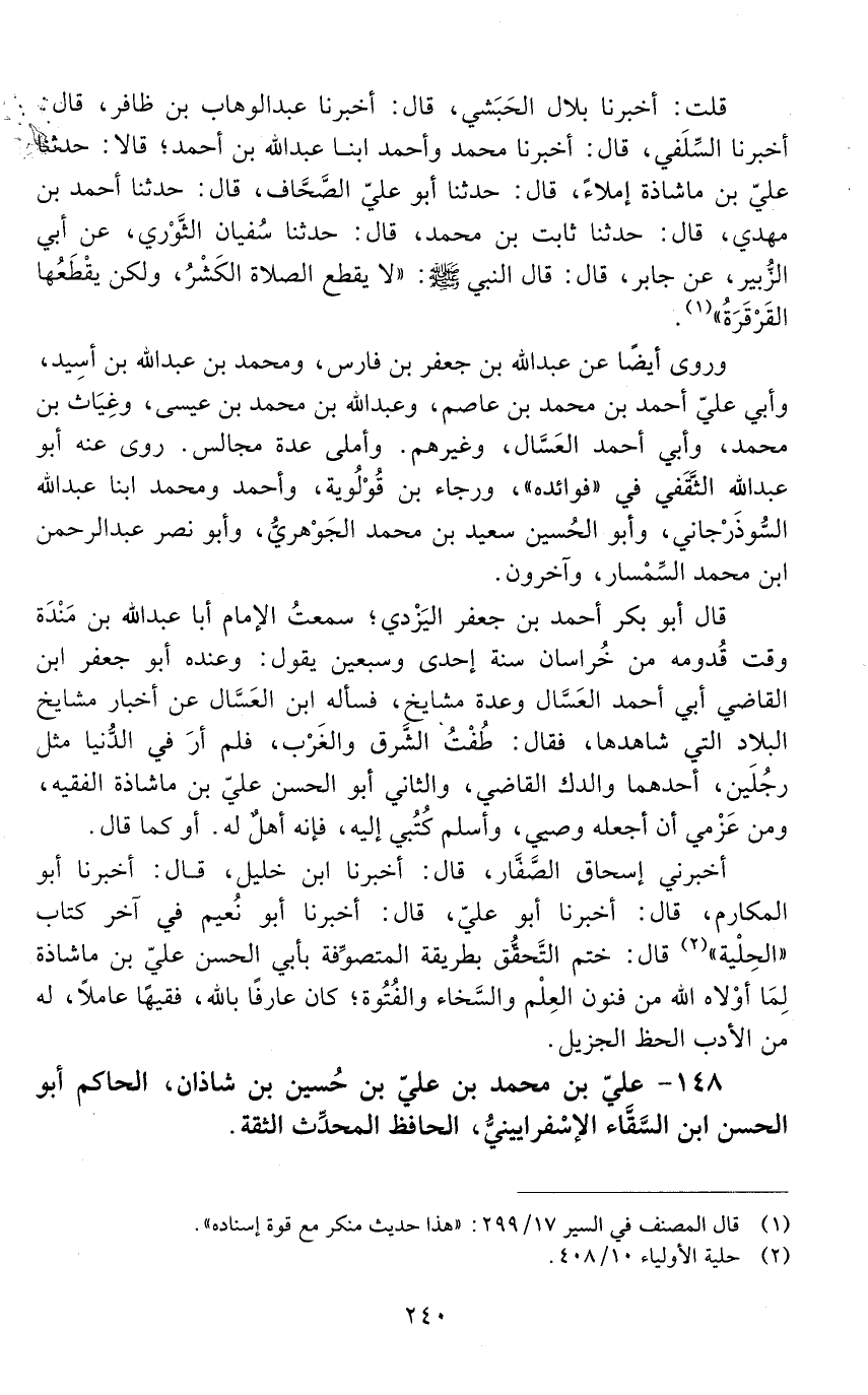 148 - علي بن محمد بن علي بن حسين بن شاذان، الحاكم أبو الحسن ابن السقاء الإسفراييني، الحافظ المُحدث، [المتوفى: 414 هـ]