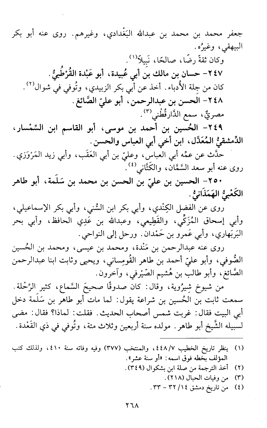 250 - الحسين بْن علي بْن الحَسَن بْن محمد بْن سَلَمَة، أبو طاهر الكعبي الهمذاني. [المتوفى: 416 هـ]