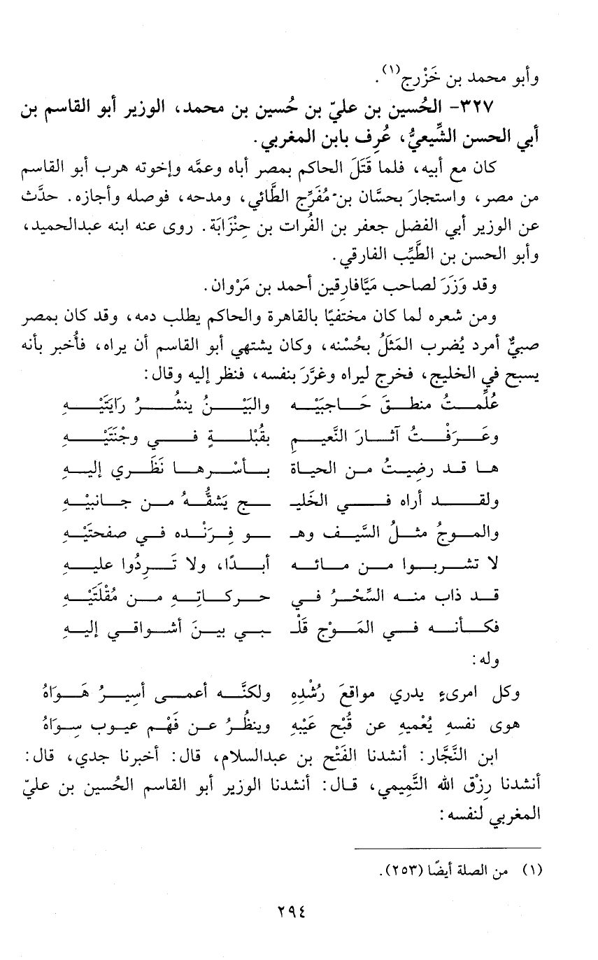 327 - الحسين بْن عليّ بْن حسين بْن محمد، الوزير أبو القاسم بْن أبي الحَسَن الشيعيّ، عُرف بابن المغربيّ. [المتوفى: 418 هـ]