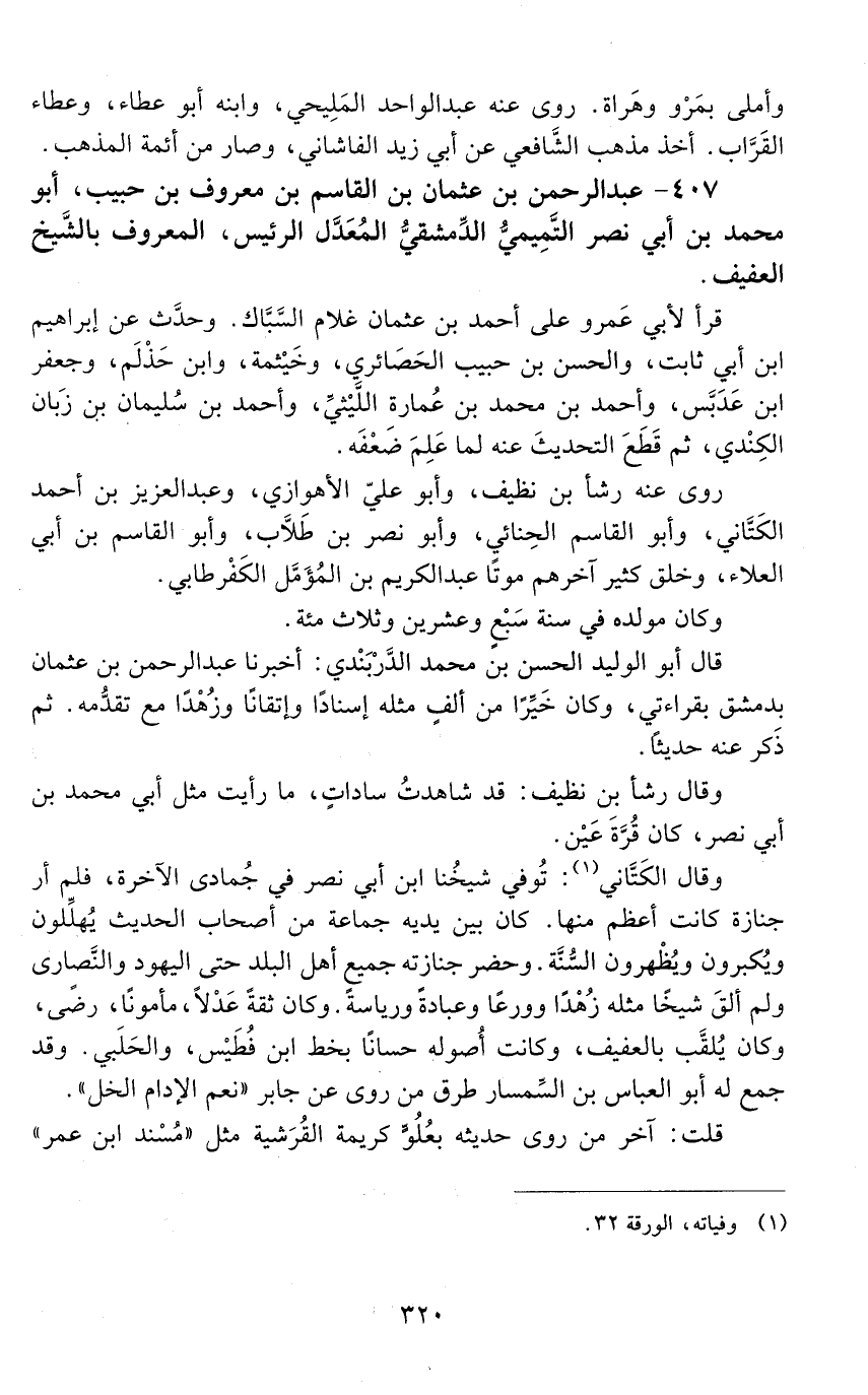 407 - عَبْد الرَّحْمَن بْن عثمان بْن القاسم بْن معروف بْن حبيب، أبو محمد بن أبي نصر التميمي، الدمشقي المعدل، الرئيس المعروف بالشّيخ العفيف. [المتوفى: 420 هـ]