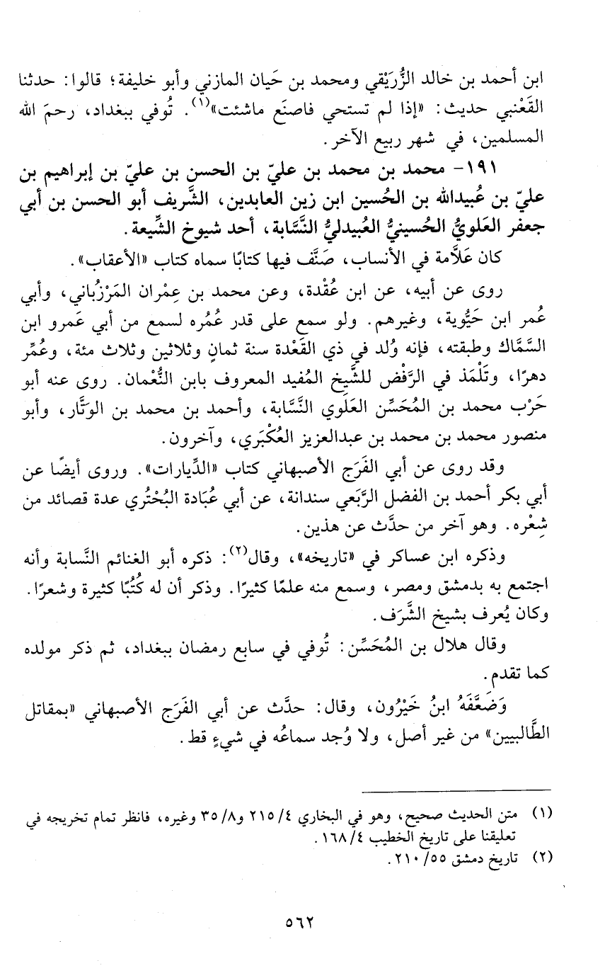 191 - محمد بن محمد بن علي بن الحَسَن بن عليّ بن إبراهيم بن عليّ بن عُبَيْد الله بن الحسين ابن زين العابدين، الشّريف أبو الحسن بن أبي جعفر العلوي الحسيني العبيدلي النَّسَّابَة، [المتوفى: 436 هـ]