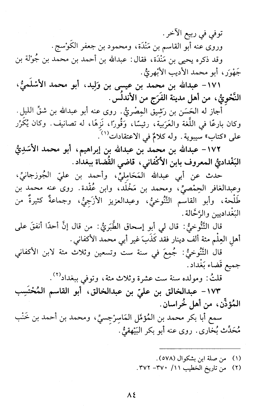172 - عَبْد اللَّهِ بْن مُحَمَّدِ بْن عَبْد اللَّهِ بْن إبراهيم، أبو محمد الأسَدي البغداديّ، المعروف بابن الأكفانيّ [المتوفى: 405 هـ]