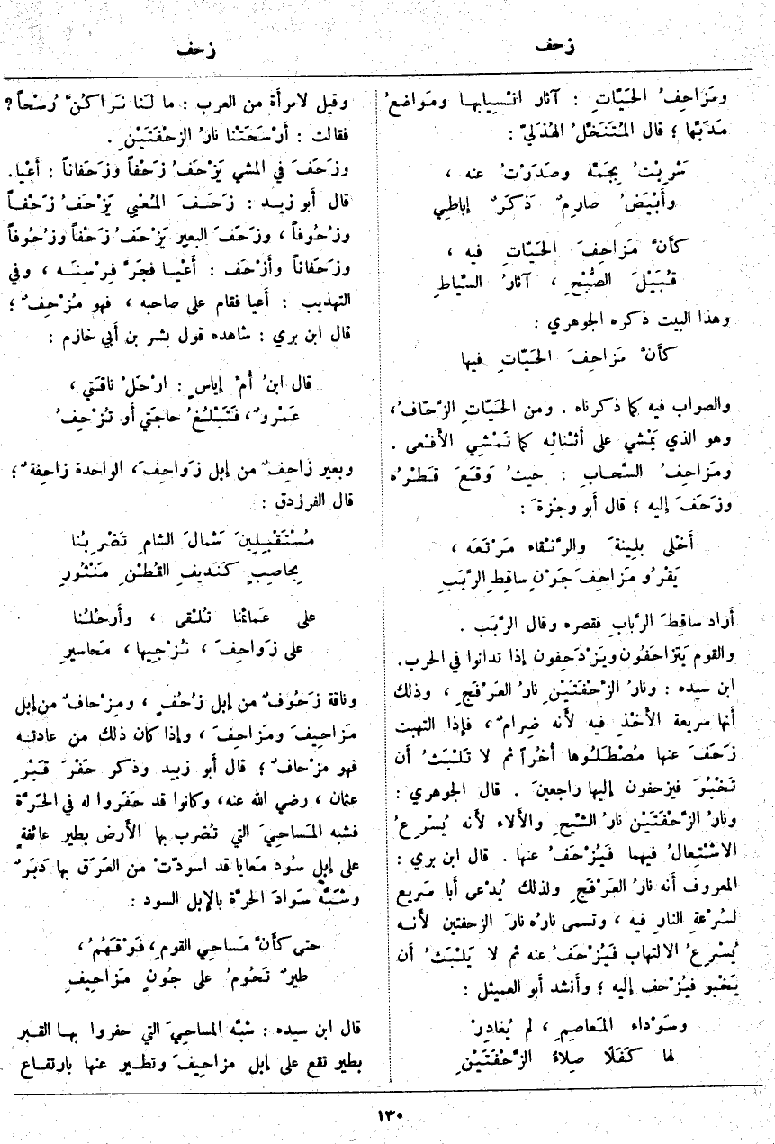 وَنَاقَةٌ زَحُوفٌ مِنْ إِبِلٍ زُحُفٍ، ومِزْحافٌ مِنْ إِبِلٍ مَزاحِيفَ ومَزاحِفَ، وَإِذَا كَانَ ذَلِكَ مِنْ عَادَتِهِ فَهُوَ مزْحَافٌ؛ قَالَ أَبو زُبَيْدٍ وَذَكَرَ حَفْرَ قَبْرِ عُثْمَانَ، رَضِيَ اللَّهُ عَنْهُ، وَكَانُوا قَدْ حَفَروا لَهُ فِي الحَرَّة فَشَبَّهَ المَساحِيَ الَّتِي تُضرب بِهَا الأَرض بِطَيْرٍ عائفةٍ عَلَى إِبِلٍ سُود مَعايا قَدِ اسودّتْ مِنَ العَرَق بِهَا دَبَرٌ وشَبَّه سَوادَ الحرَّة بالإِبل السُّودِ: