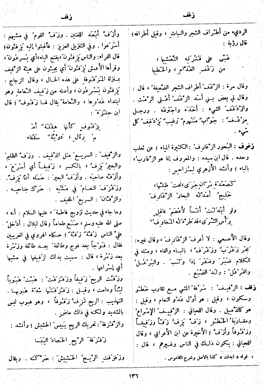 زفف: الزَّفيفُ: سُرْعةُ الْمَشْيِ مَعَ تَقَارُبِ خَطْو وَسُكُونٍ، وَقِيلَ: هُوَ أَوّل عَدْو النَّعَامِ، وَقِيلَ: هُوَ كالذَّمِيل. وَقَالَ اللِّحْيَانِيُّ: الزَّفِيفُ الإِسْراعُ ومقاربةُ الخَطْوِ، زَفَّ يَزِفُّ زَفّاً وزَفِيفاً وزُفُوفاً وأَزَفَّ؛ الأَخيرة عَنِ ابْنِ الأَعرابي، وَقَالَ اللِّحْيَانِيُّ: يَكُونُ ذَلِكَ فِي النَّاسِ وَغَيْرِهِمْ، قَالَ: وأَزَفَّ أَبْعَد اللُّغَتَيْنِ. وزَفَّ القومُ فِي مَشْيِهِمْ: أَسْرَعوا. وَفِي التَّنْزِيلِ الْعَزِيزِ: فَأَقْبَلُوا إِلَيْهِ يَزِفُّونَ