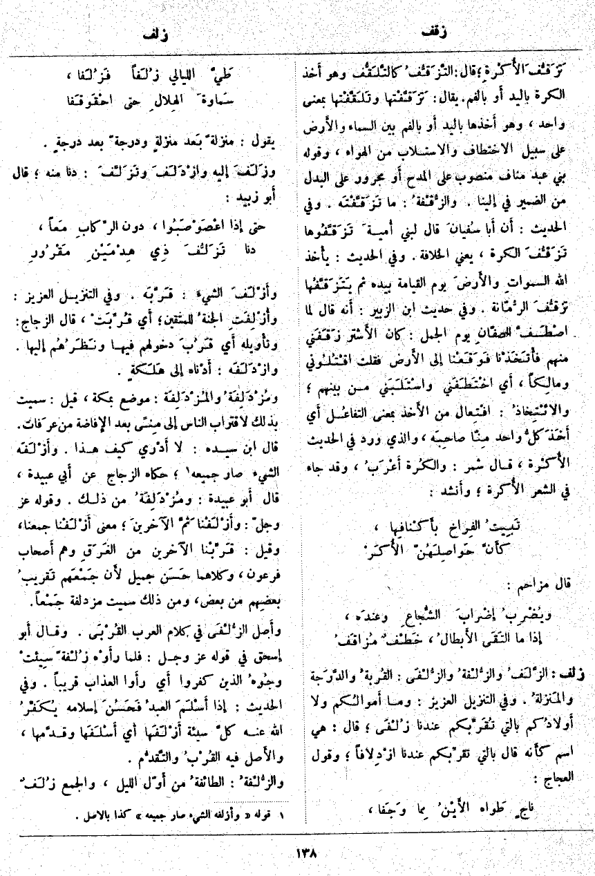 زلف: الزَّلَفُ والزُّلْفةُ والزُّلْفَى: القُربةُ والدَّرَجة والمَنزلةُ. وَفِي التَّنْزِيلِ الْعَزِيزِ: وَما أَمْوالُكُمْ وَلا أَوْلادُكُمْ بِالَّتِي تُقَرِّبُكُمْ عِنْدَنا زُلْفى