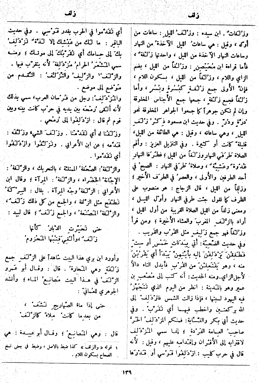 وأَورد ابْنُ بَرِّيٍّ هَذَا الْبَيْتُ شَاهِدًا عَلَى الزَّلَفِ جَمْعِ زَلَفَةٍ وَهِيَ المَحارةُ. قَالَ: وَقَالَ أَبو عَمرو الزَّلَفُ فِي هَذَا الْبَيْتِ مَصانِعُ الْمَاءِ؛ وأَنشد الْجَوْهَرِيُّ للعُمانيّ: