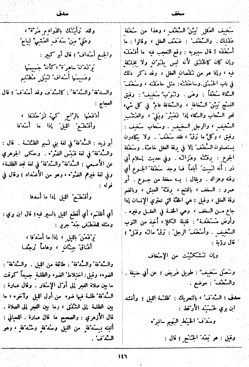 سدف: السَّدَفُ، بِالتَّحْرِيكِ: ظُلْمة اللَّيْلِ؛ وأَنشد ابْنُ بَرِّيٍّ لحُمَيْد الأَرْقط: