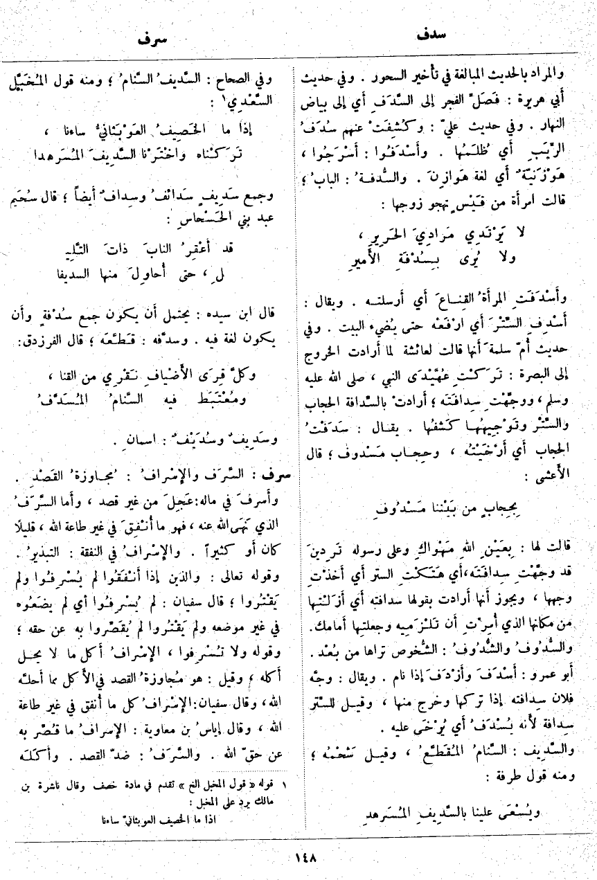 سرف: السَّرَف والإِسْرَافُ: مُجاوزةُ القَصْدِ. وأَسْرَفَ فِي مَالِهِ: عَجِلَ مِنْ غَيْرِ قَصْدٍ، وأَما السَّرَفُ الَّذِي نَهَى اللَّهُ عَنْهُ، فَهُوَ مَا أُنْفِقَ فِي غَيْرِ طَاعَةِ اللَّهِ، قَلِيلًا كَانَ أَو كَثِيرًا. والإِسْرافُ فِي النَّفَقَةِ: التبذيرُ. وَقَوْلُهُ تَعَالَى: وَالَّذِينَ إِذا أَنْفَقُوا لَمْ يُسْرِفُوا وَلَمْ يَقْتُرُوا