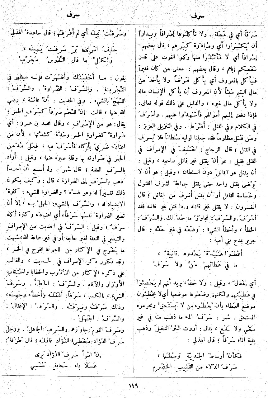 ؛ يُقَالُ: هُوَ مِنَ الإِسْرافِ، وَقَالَ مُحَمَّدُ بْنُ عَمْرٍو: أَي ضَراوةً كضراوةِ الْخَمْرِ وَشِدَّةً كشدَّتها، لأَن مَنِ اعتادَه ضَرِيَ بأَكله فأَسْرَفَ فِيهِ، فِعْلَ مُدْمِن الْخَمْرِ فِي ضَراوته بِهَا وَقِلَّةِ صَبْرِهِ عَنْهَا، وَقِيلَ: أَراد بالسرَفِ الْغَفْلَةَ؛ قَالَ شَمِرٌ: وَلَمْ أَسمع أَن أَحَدًا ذَهب بالسَّرَفِ إِلَى الضَّرَاوَةِ، قَالَ: وَكَيْفَ يَكُونُ ذَلِكَ تَفْسِيرًا لَهُ وَهُوَ ضِدُّهُ؟ وَالضَّرَاوَةُ لِلشَّيْءِ: كثرةُ الاعتِياد لَهُ، والسَّرَف بِالشَّيْءِ: الجهلُ بِهِ، إِلَّا أَن تَصِيرَ الضراوةُ نفسُها سَرَفاً، أَي اعتيادُه وَكَثْرَةُ أَكله سَرَفٌ، وَقِيلَ: السَّرَفُ فِي الْحَدِيثِ مِنَ الإِسرافِ وَالتَّبْذِيرِ فِي النَّفَقَةِ لِغَيْرِ حَاجَةٍ أَو فِي غَيْرِ طَاعَةِ اللَّهِ، شَبَّهَتْ مَا يَخْرج فِي الإِكثار مِنَ اللَّحْمِ بِمَا يَخْرُجُ فِي الْخَمْرِ، وَقَدْ تَكَرَّرَ ذِكْرُ الإِسراف فِي الْحَدِيثِ، وَالْغَالِبُ عَلَى ذِكْرِهِ الإِكثار مِنَ الذُّنُوب وَالْخَطَايَا واحْتِقابِ الأَوْزار وَالْآثَامِ. والسَّرَفُ: الخَطَأُ. وسَرِفَ الشيءَ، بِالْكَسْرِ، سَرَفاً: أَغْفَلَه وأَخطأَه وجَهِلَه، وَذَلِكَ سَرْفَتُه وسِرْفَتُه. والسَّرَفُ: الإِغفالُ. والسَّرَفُ: الجَهْلُ. وسَرِفَ القومَ: جاوَزهم. والسَّرِفُ: الجاهلُ وَرَجُلٌ سَرِفُ الفُؤاد: مُخْطِئُ الفُؤادِ غافِلُه؛ قَالَ طَرَفةُ:
