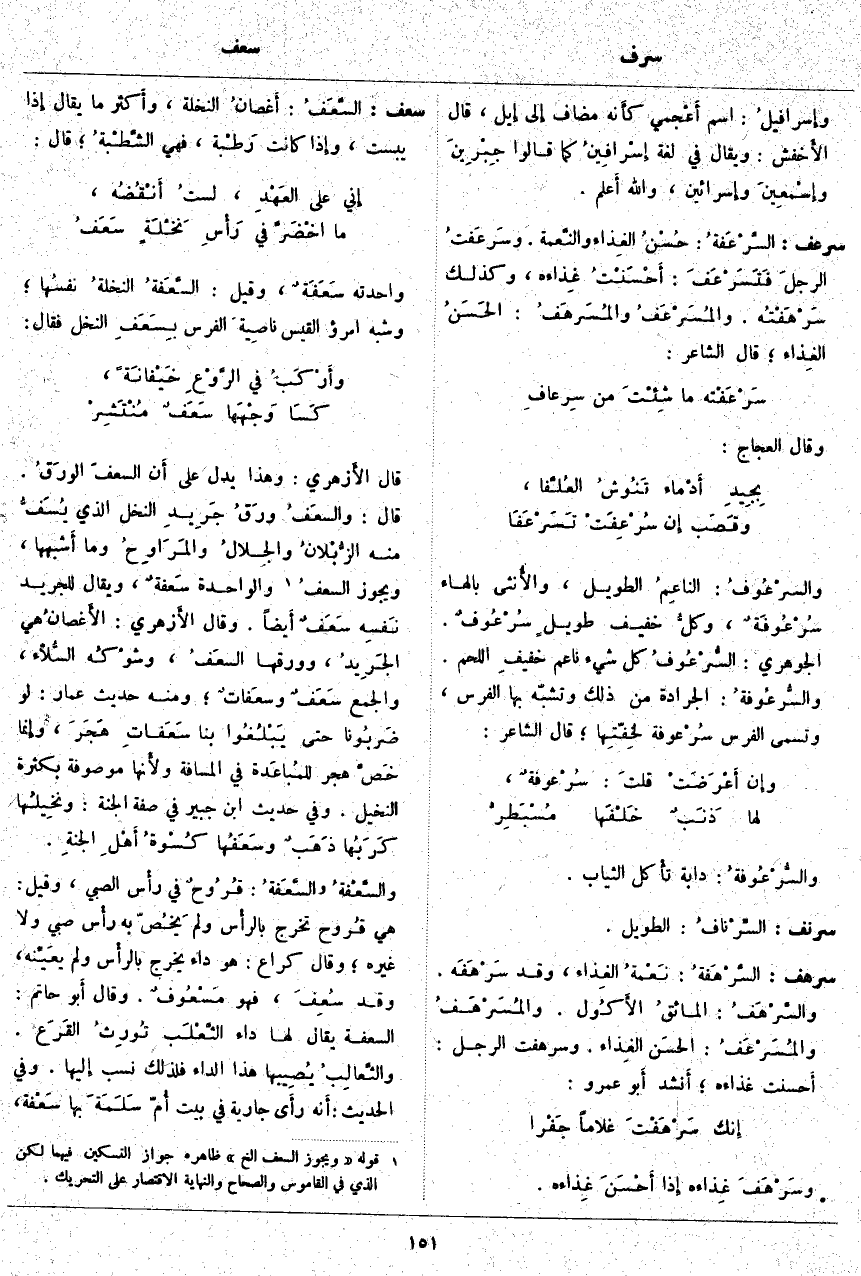 سرهف: السَّرْهَفَةُ: نَعْمةُ الغِذاء، وَقَدْ سَرْهَفَه. والسَّرْهَفُ: المائقُ الأَكُول. والمُسَرْهَفُ والمُسَرْعَفُ: الحسَن الغِذاء. وَسَرْهَفْتُ الرَّجُلَ: أَحسنت غِذَاءَهُ؛ أَنشد أَبو عَمْرٍو: