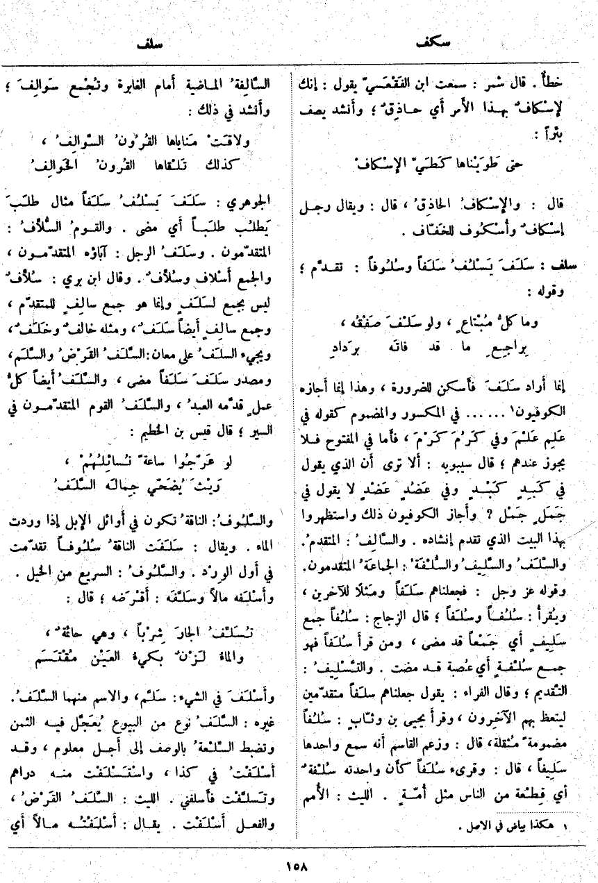 إِنَّمَا أَراد سَلَفَ فأَسكن لِلضَّرُورَةِ، وَهَذَا إِنَّمَا أَجازه الْكُوفِيُّونَ «1» ...... فِي الْمَكْسُورِ وَالْمَضْمُومِ كَقَوْلِهِ فِي عَلِم عَلْمَ وَفِي كَرُمَ كَرْمَ، فأَما فِي الْمَفْتُوحِ فَلَا يَجُوزُ عِنْدَهُمْ؛ قَالَ سِيبَوَيْهِ: أَلا تَرَى أَن الَّذِي يَقُولُ فِي كَبِدٍ كَبْدٍ. وَفِي عْضُدٍ عَضْدٍ لَا يَقُولُ فِي جَمَلٍ جَمْل؟ وأَجاز الْكُوفِيُّونَ ذَلِكَ وَاسْتَظْهَرُوا بِهَذَا الْبَيْتِ الَّذِي تَقَدَّمَ إِنْشَادُهُ. والسَّالِفُ: المتقدمُ. والسَّلَفُ والسَّلِيفُ والسُّلْفَةُ: الجماعَةُ الْمُتَقَدِّمُونَ. وَقَوْلُهُ عَزَّ وَجَلَّ: فَجَعَلْناهُمْ سَلَفاً وَمَثَلًا لِلْآخِرِينَ