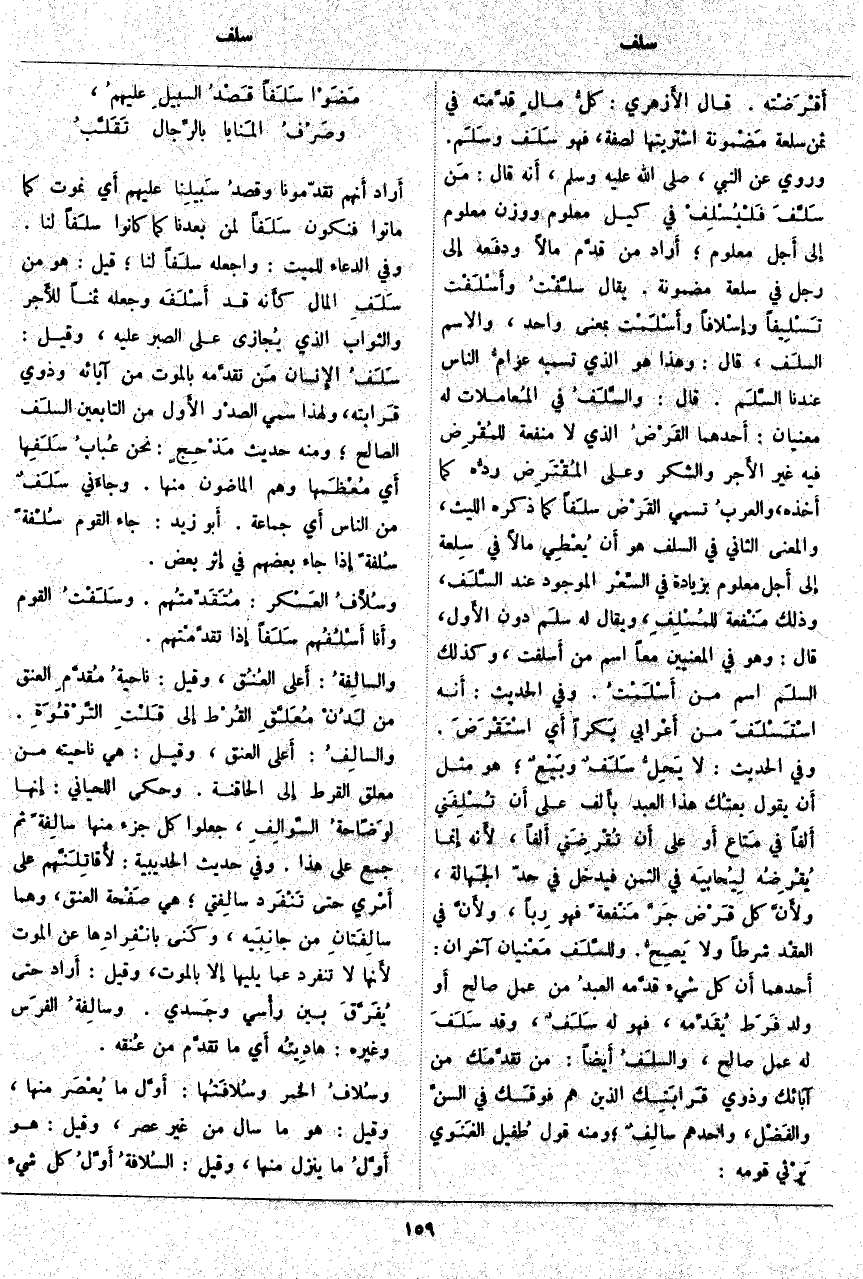 ؛ أَراد مَنْ قدَّم مَالًا ودفَعه إِلَى رَجُلٍ فِي سِلْعَةٍ مَضْمُونَةٍ. يُقَالُ سلَّفْتُ وأَسْلَفْتُ تَسْلِيفاً وإسْلافاً وأَسْلَمْت بِمَعْنًى وَاحِدٍ، وَالِاسْمُ السَّلَف، قَالَ: وَهَذَا هُوَ الَّذِي تُسَمِّيهِ عوامُّ النَّاسِ عِنْدَنَا السَّلَم. قَالَ: والسَّلَفُ فِي المُعاملات لَهُ مَعْنَيَانِ: أَحدهما القَرْضُ الَّذِي لَا مَنْفَعَةَ للمُقْرِض فِيهِ غَيْرُ الأَجر وَالشُّكْرِ وَعَلَى المُقْتَرِض ردُّه كَمَا أَخذه، والعربُ تُسَمِّي القَرْض سَلَفاً كَمَا ذَكَرَهُ اللَّيْثُ، وَالْمَعْنَى الثَّانِي فِي السَّلَفِ هُوَ أَن يُعْطِي مَالًا فِي سِلعة إِلَى أَجل مَعْلُومٍ بِزِيَادَةٍ فِي السِّعْر الْمَوْجُودِ عِنْدَ السَّلَف، وَذَلِكَ مَنْفعة للمُسْلِفِ، وَيُقَالُ لَهُ سلَم دُونَ الأَول قَالَ: وَهُوَ فِي الْمَعْنَيَيْنِ مَعًا اسْمٌ مَنْ أَسلفت، وَكَذَلِكَ السلَم اسْمٌ مِنْ أَسْلَمْتُ. وَفِي الْحَدِيثِ: