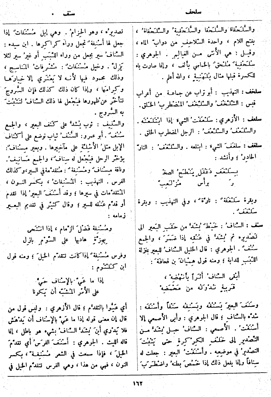 سنف: السِّنافُ: خَيْطٌ يُشَدُّ مِنْ حَقَبِ البَعير إِلَى تَصْدِيره ثُمَّ يُشَدُّ فِي عُنُقِه إِذا ضَمَرَ، وَالْجَمْعُ سُنُفٌ. الْجَوْهَرِيُّ: قَالَ الْخَلِيلُ السِّنافُ لِلْبَعِيرِ بِمَنْزِلَةِ اللّبَبِ لِلدَّابَّةِ؛ وَمِنْهُ قَوْلُ هِميانَ بْنِ قحافَةَ: