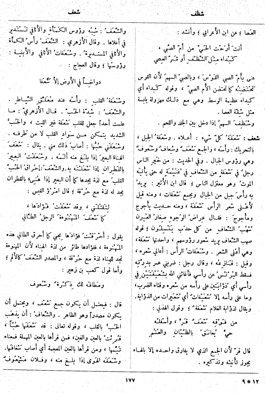 شعف: شَعَفَةُ كُلِّ شَيْءٍ: أَعلاه. وشَعَفَةُ الْجَبَلِ، بِالتَّحْرِيكِ: رأْسُه، وَالْجَمْعُ شَعَفٌ وشِعَافٌ وشُعُوفٌ وهي رؤوس الْجِبَالِ. وَفِي الْحَدِيثِ: