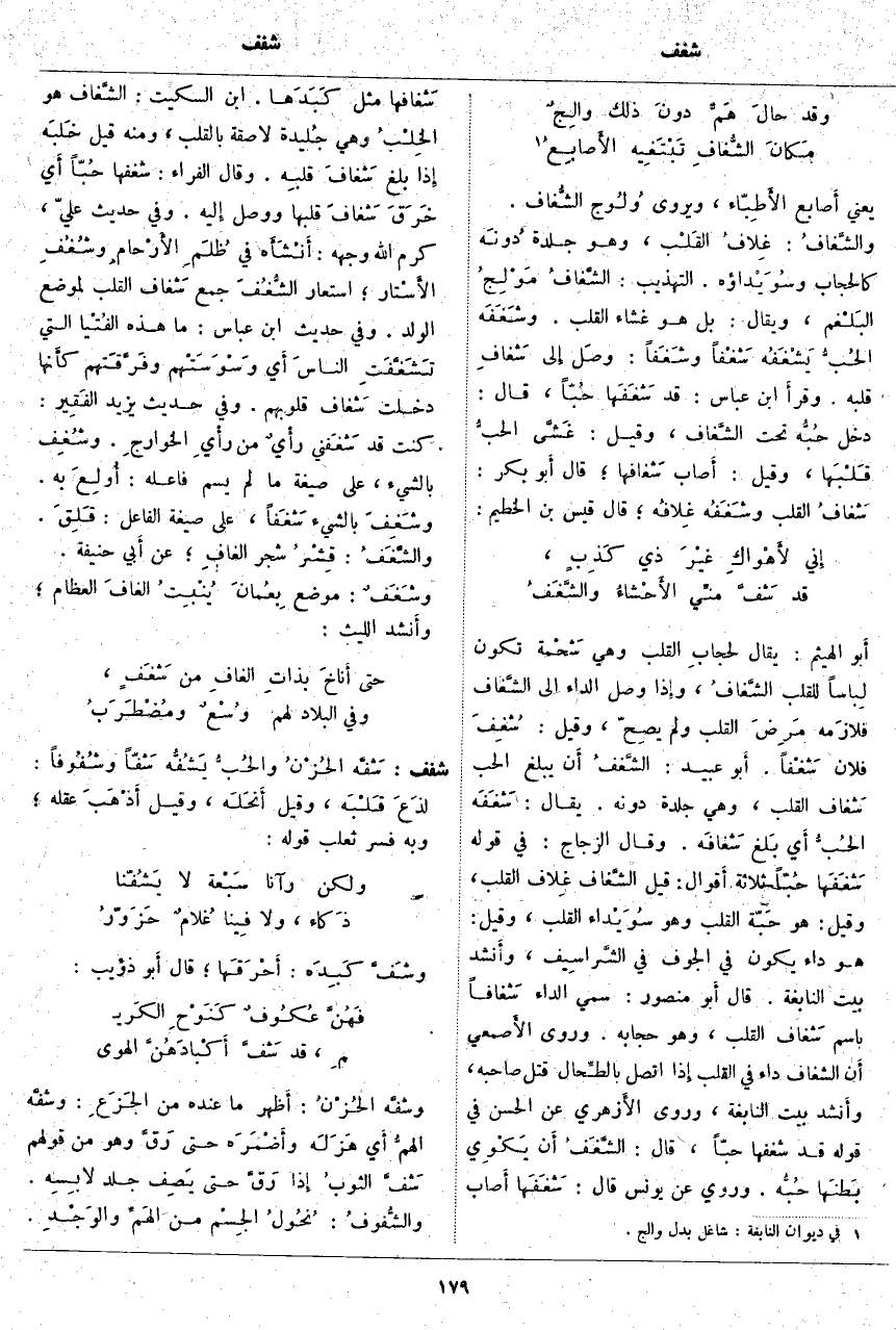 أَبو الْهَيْثَمِ: يُقَالُ لحجابِ الْقَلْبِ وَهِيَ شَحْمة تَكُونُ لِباساً لِلْقَلْبِ الشَّغَافُ، وإذا وَصَلَ الدَّاءُ إِلَى الشَّغَاف فلازَمه مَرِضَ الْقَلْبُ وَلَمْ يصِحّ، وَقِيلَ: شُغِفَ فُلَانٌ شَغْفاً. أَبو عُبَيْدٍ: الشَّغَفُ أَن يَبْلُغَ الْحُبُّ شَغاف الْقَلْبِ، وَهِيَ جِلْدَةٌ دُونَهُ. يُقَالُ: شَغَفَه الحُبُّ أَي بَلغ شَغافَه. وَقَالَ الزَّجَّاجُ: فِي قَوْلِهِ شَغَفَها حُبًّا