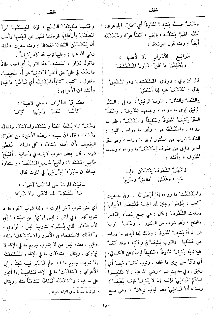 ؛ قَالَ: هِيَ جمعُ شِفّ، بِالْكَسْرِ وَالْفَتْحِ، وَهُوَ ضَرْبٌ مِنَ السُّتُورِ. وشَفَّ الثوبُ عَنِ المرأَة يَشِفُّ شُفُوفاً: وَذَلِكَ إِذَا أَبدى مَا وَرَاءَهُ مِنْ خَلْقِها. وَالثَّوْبُ يَشِفُّ فِي رِقَّتِه، وَقَدْ شَفَّ عَلَيْهِ ثوبُه يَشِفُّ شُفوفاً وشَفِيفاً أَيضاً؛ عَنِ الْكِسَائِيِّ، أَي رَقَّ حَتَّى يُرَى مَا خَلْفَهُ. وَثَوْبٌ شَفّ وشِفّ أَي رَقِيقٌ. وَفِي حَدِيثِ