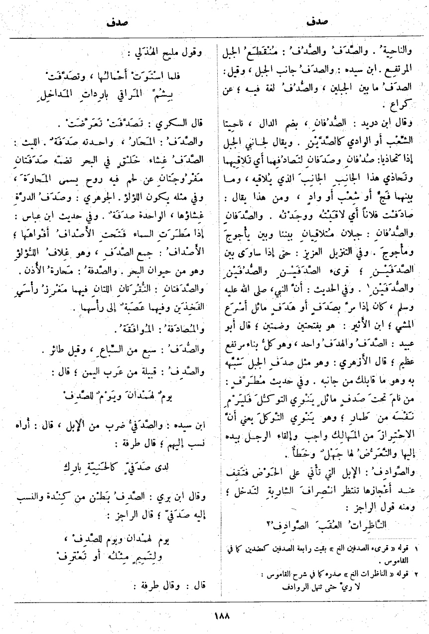 قَالَ السُّكَّرِيُّ: تَصَدَّفَتْ تَعَرَّضَتْ. والصَّدَفُ: المَحارُ، وَاحِدَتُهُ صَدَفَةٌ. اللَّيْثُ: الصَّدَفُ غِشاء خَلْقٍ فِي الْبَحْرِ تَضُمُّهُ صَدَفَتانِ مَفْرُوجَتانِ عَنْ لَحْمٍ فِيهِ رُوحٌ يُسَمَّى المَحارَةَ، وَفِي مِثْلِهِ يَكُونُ اللُّؤْلُؤُ. الْجَوْهَرِيُّ: وصَدَفُ الدرَّةِ غِشاؤها، الْوَاحِدَةُ صَدَفَةٌ. وَفِي حَدِيثِ