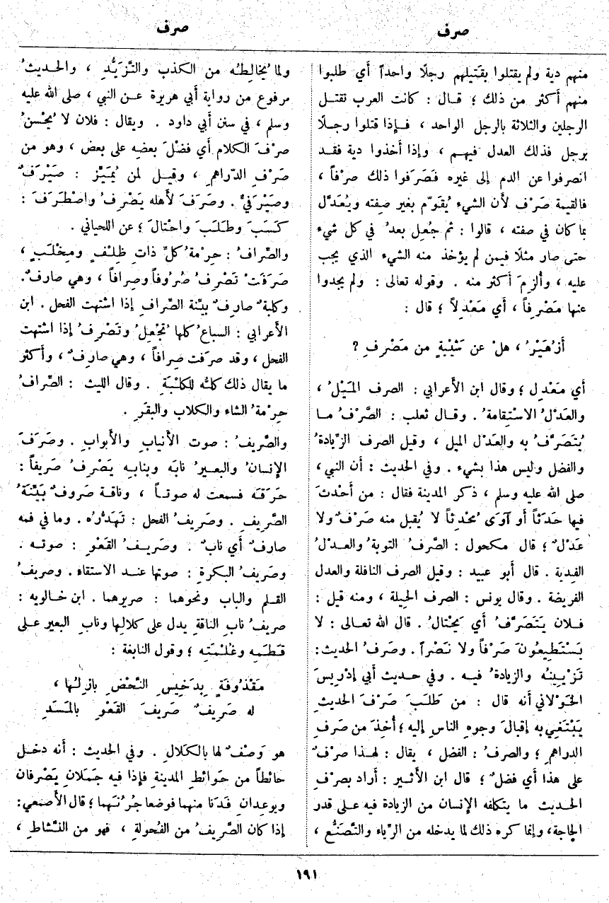 مِنْهُمْ دِيَةً وَلَمْ يَقْتُلُوا بقَتيلهم رَجُلًا وَاحِدًا أَي طَلَبُوا مِنْهُمْ أَكثر مِنْ ذَلِكَ؛ قَالَ: كَانَتِ الْعَرَبُ تَقْتُلُ الرَّجُلَيْنِ وَالثَّلَاثَةَ بِالرَّجُلِ الْوَاحِدِ، فَإِذَا قَتَلُوا رَجُلًا بِرَجُلٍ فَذَلِكَ الْعَدْلُ فِيهِمْ، وَإِذَا أَخذوا دِيَةً فَقَدِ انْصَرَفُوا عَنِ الدَّمِ إِلَى غَيْرِهِ فَصَرَفوا ذَلِكَ صرْفاً، فَالْقِيمَةُ صَرْف لأَن الشَّيْءَ يُقَوّم بِغَيْرِ صِفته ويُعَدَّل بِمَا كَانَ فِي صِفَتِهِ، قَالُوا: ثُمَّ جُعِل بعدُ فِي كُلِّ شَيْءٍ حَتَّى صَارَ مَثَلًا فِيمَنْ لَمْ يُؤْخَذْ مِنْهُ الشَّيْءُ الَّذِي يَجِبُ عَلَيْهِ، وأُلزِمَ أَكثر مِنْهُ. وَقَوْلُهُ تَعَالَى: وَلَمْ يَجِدُوا عَنْها مَصْرِفاً