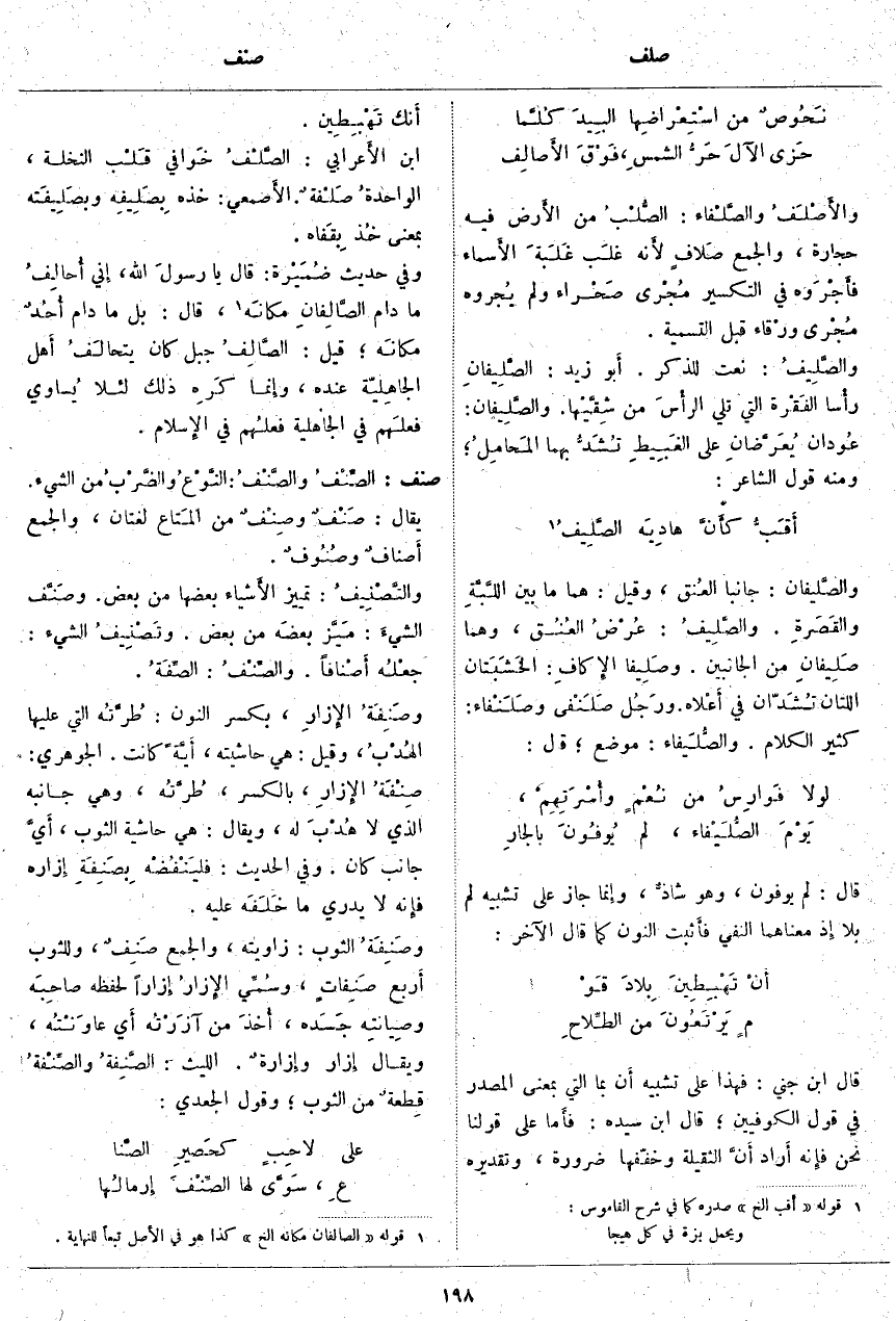 صنف: الصِّنْفُ والصَّنْفُ: النَّوْعُ والضَّرْبُ مِنَ الشَّيْءِ. يُقَالُ: صَنْفٌ وصِنْفٌ مِنَ المَتاع لُغَتَانِ، وَالْجَمْعُ أَصْنَافٌ وصُنُوفٌ. والتَّصْنِيفُ: تَمْيِيزُ الأَشياء بَعْضِهَا مِنْ بَعْضٍ. وصَنَّفَ الشيءَ: مَيَّز بعضَه مِنْ بَعْضٍ. وتَصْنِيفُ الشَّيْءِ: جعْلُه أَصْنَافاً. والصِّنْفُ: الصِّفَةُ. وصَنِفَةُ الإِزارِ، بِكَسْرِ النُّونِ: طُرَّتُه الَّتِي عَلَيْهَا الهُدْبُ، وَقِيلَ: هِيَ حَاشِيَتُهُ، أَيَّةً كَانَتْ. الْجَوْهَرِيُّ: صِنْفَةُ الإِزارِ، بِالْكَسْرِ، طُرَّتُه، وَهِيَ جَانِبُهُ الَّذِي لَا هُدْبَ لَهُ، وَيُقَالُ: هِيَ حَاشِيَةُ الثَّوْبِ، أَيَّ جَانِبٍ كَانَ. وَفِي الْحَدِيثِ: