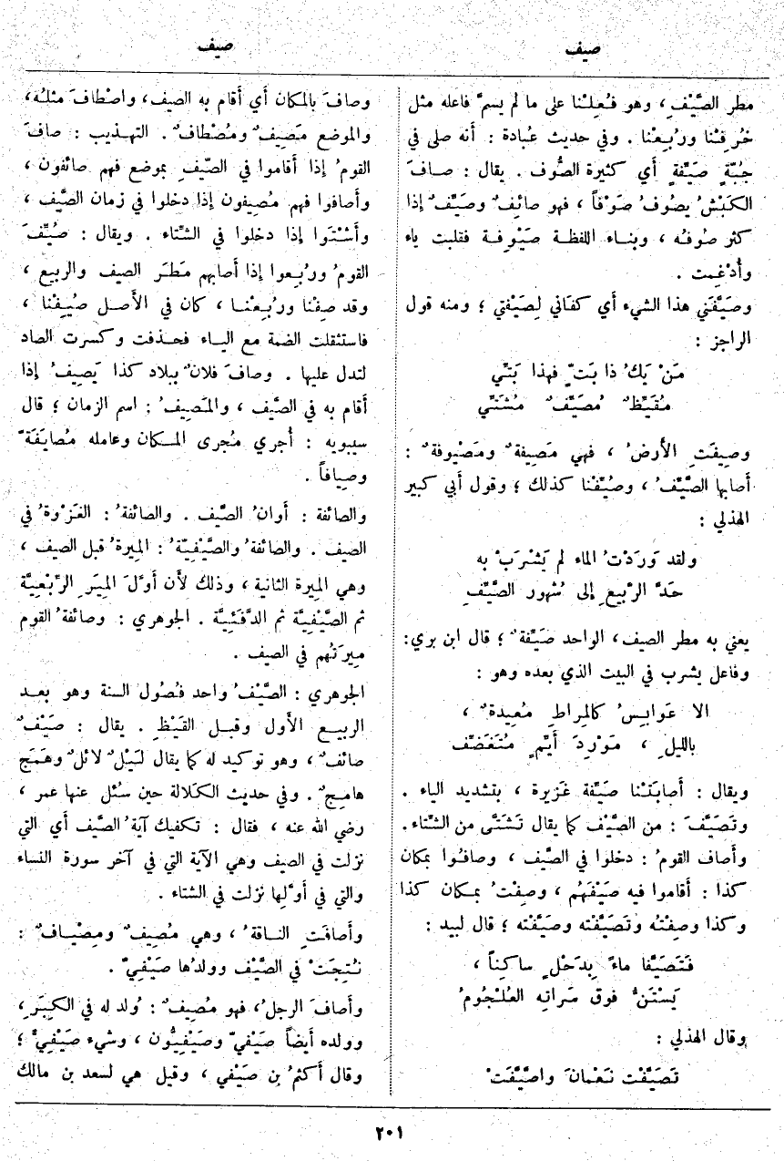 وصَافَ بِالْمَكَانِ أَي أَقام بِهِ الصَّيْفَ، واصْطَافَ مثلُه، وَالْمَوْضِعُ مَصِيفٌ ومُصْطَافٌ. التَّهْذِيبُ: صَافَ القومُ إِذَا أَقاموا فِي الصّيفِ بِمَوْضِعٍ فَهُمْ صَائِفُون، وأَصَافُوا فَهُمْ مُصِيفُون إِذَا دَخَلُوا فِي زَمَانِ الصَّيف، وأَشْتَوا إِذَا دَخَلُوا فِي الشِّتاء. وَيُقَالُ: صُيِّفَ القومُ ورُبِعوا إِذَا أَصابهم مَطَر الصَّيْفِ وَالرَّبِيعِ، وَقَدْ صِفْنا ورُبِعْنا، كَانَ فِي الأَصل صُيِفْنا، فَاسْتُثْقِلَتِ الضَّمَّةُ مَعَ الْيَاءِ فَحُذِفَتْ وَكُسِرَتِ الصَّادُ لِتَدُلَّ عَلَيْهَا. وصَافَ فلانٌ بِبِلَادِ كَذَا يَصِيفُ إِذَا أَقام بِهِ فِي الصَّيف، والمَصِيفُ: اسْمُ الزَّمَانِ؛ قَالَ سِيبَوَيْهِ: أُجري مُجرى الْمَكَانِ وَعَامِلِهِ مُصَايَفَةً وصِيافاً. وَالصَّائِفَةُ: أَوانُ الصَّيف. والصائفةُ: الغَزْوةُ فِي الصَّيْفِ. والصائفةُ والصَّيْفِيّةُ: المِيرةُ قُبُلِ الصَّيْفِ، وَهِيَ المِيرة الثَّانِيَةُ، وَذَلِكَ لأَن أَوَّلَ المِيَرِ الرِّبْعِيَّة ثُمَّ الصَّيْفِيَّة ثُمَّ الدَّفَئِيَّة. الْجَوْهَرِيُّ: وصائفةُ الْقَوْمِ مِيرَتُهم فِي الصَّيْفِ. الْجَوْهَرِيُّ: الصَّيْفُ وَاحِدُ فُصُول السَّنَةِ وَهُوَ بعد الربيع الأَول وَقَبْلَ القَيْظِ. يُقَالُ: صَيْفٌ صَائِفٌ، وَهُوَ تَوْكِيدٌ لَهُ كَمَا يُقَالُ لَيْلٌ لائلٌ وهَمَج هامِجٌ. وَفِي حَدِيثِ