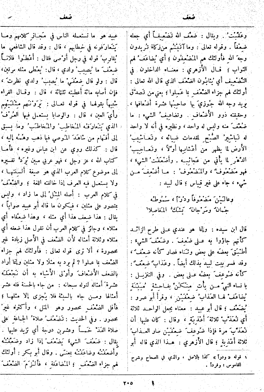 قَالَ ابْنُ سِيدَهْ: وَإِنَّمَا هُوَ عِنْدِي عَلَى طَرْحِ الزَّائِدِ كأَنهم جاؤوا بِهِ عَلَى ضُعِفَ. وضَعَّفَ الشيءَ: أَطْبَقَ بعضَه عَلَى بَعْضٍ وثَناه فَصَارَ كأَنه ضِعْفٌ، وَقَدْ فُسِّرَ بَيْتُ لَبِيدٍ بِذَلِكَ أَيضاً. وعَذابٌ ضِعْفٌ: كأَنه ضُوعِفَ بعضُه عَلَى بَعْضٍ. وَفِي التَّنْزِيلِ: يا نِساءَ النَّبِيِّ مَنْ يَأْتِ مِنْكُنَّ بِفاحِشَةٍ مُبَيِّنَةٍ يُضاعَفْ لَهَا الْعَذابُ ضِعْفَيْنِ