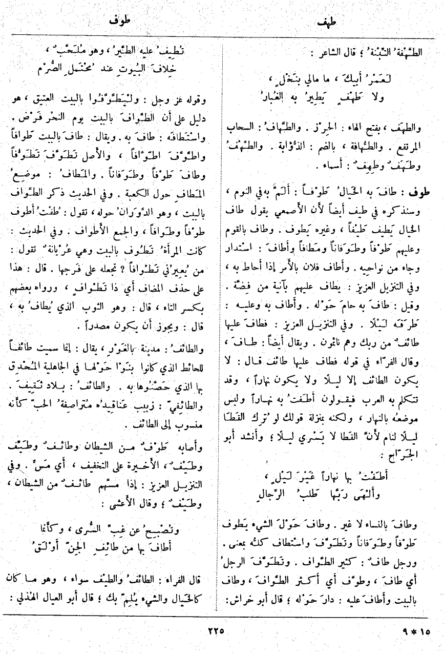 طوف: طافَ بِهِ الخَيالُ طَوْفاً: أَلَمَّ بِهِ فِي النَّوْمِ، وَسَنَذْكُرُهُ فِي طَيْفٍ أَيضاً لأَن الأَصمعي يَقُولُ طَافَ الْخَيَالُ يَطيف طَيْفاً، وَغَيْرُهُ يَطوف. وَطَافَ بِالْقَوْمِ وَعَلَيْهِمْ طَوْفاً وطَوَفَاناً ومَطافاً وأَطَافَ: اسْتدار وَجَاءَ مِنْ نواحِيه. وأَطَاف فُلَانٌ بالأَمر إِذَا أَحاط بِهِ، وَفِي التَّنْزِيلِ الْعَزِيزِ يُطافُ عَلَيْهِمْ بِآنِيَةٍ مِنْ فِضَّةٍ